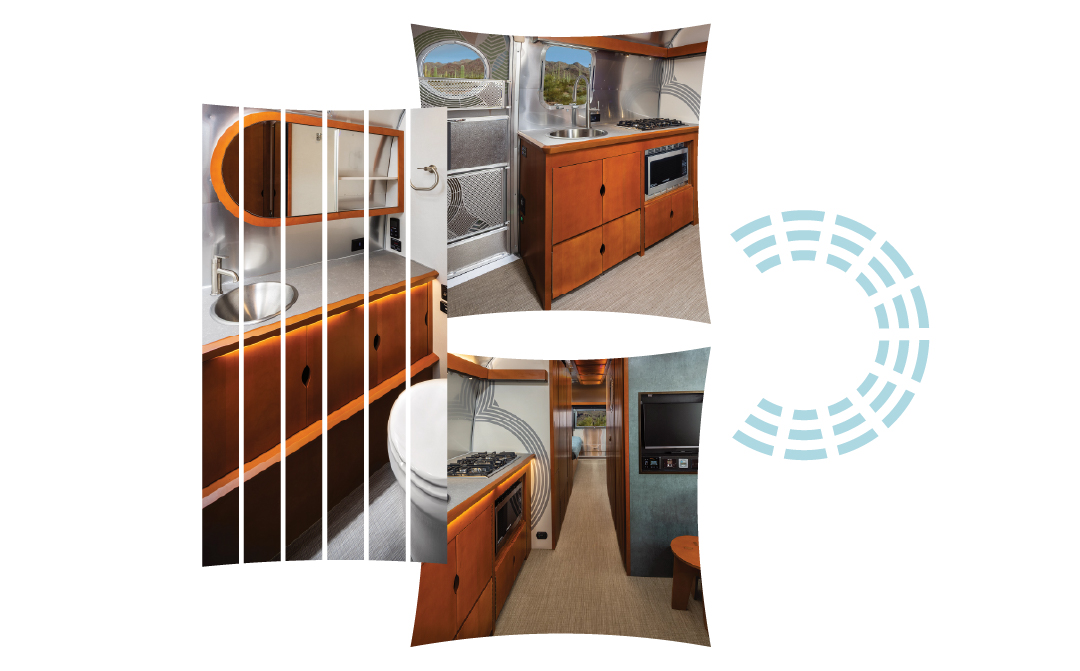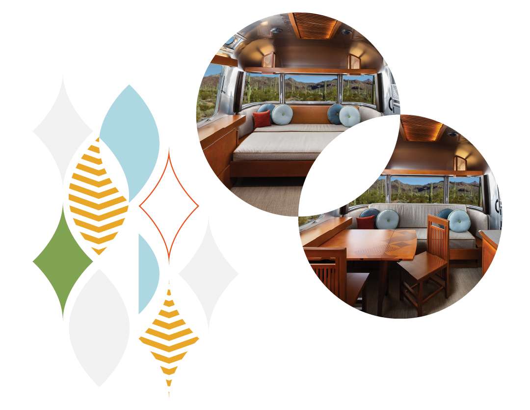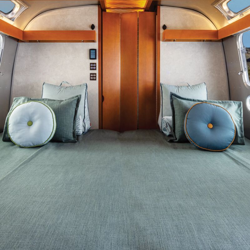 Airstream's first Rear Hatch in a bedroom invites the outdoors in. Enjoy twin-to-king convertible beds, tailored slipcovers, and quilted accents that turn this sleeping space into a lounging or hosting area.