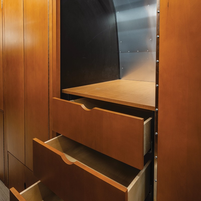 Designed for modern flexibility, twin beds convert to a king at the touch of a button, while the front lounge transforms from a dinette to a desk or sleeper. Hidden storage and modular furniture allow for seamless transitions between work, rest, and entertaining